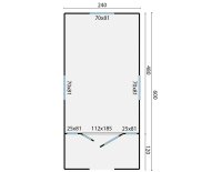 Maße: L600cm x B240cm, Höhe mit Untergestelle 325cm, incl. 5 Fenster und eine Doppeltür, 19mm Wandstärke, Bausatz (Radsatz als Zubehör erhältlich)